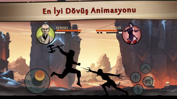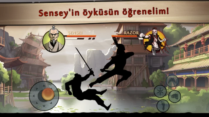 Shadow Fight 2 Special Edition Apk 2025, yumruklar, tekmeler, zıplamalar ve silah saldırıları için basit ekran üstü joystick ve düğme kontrollerini kullanır.