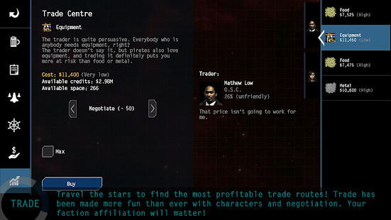 Space RPG 4'te yapmanız gereken ilk iş, geniş alan içinde nasıl hareket edeceğinizi ve ticaret yapacağınızı seçmektir, çünkü gerekli şeyleri ve kredileri kazanmanın yolu budur. Aynı zamanda bu oyunun mekaniği ile ilgili ilginç bir nokta, paradan tasarruf etmek için orijinal fiyattan farklı fiyatlar sunmaya çalışacağınız pazarlık mekanizmasıdır. Ama bu tamamen basit bir iş değil.